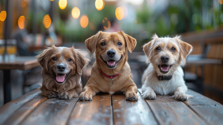 Three friendly dogs are facing the camera, displaying their unique fur and bright expressions in a lively venue.