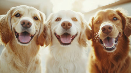 Three adorable dogs sit close together, joyfully posing with wide smiles. Sunlight streams through the window, illuminating their fur in a cozy atmosphere.