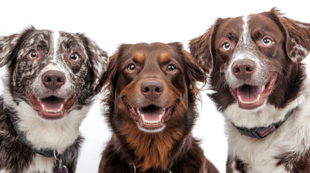 Three dogs are posed together in a well-lit studio, showing their joyful demeanor. The dogs exhibit distinct fur patterns and colors, enhancing their playful appearance.
