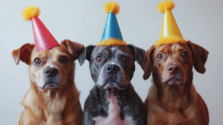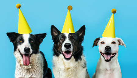 Three happy dogs in bright party hats come together for a festive celebration.