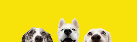Banner three hide funny surprised dogs puppies isolated on yellow background.