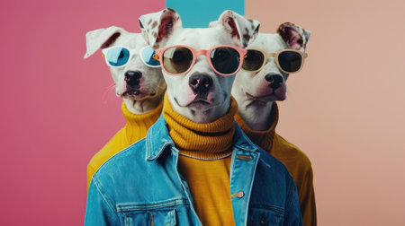 Three stylish dogs with sunglasses on a vibrant pink and blue background, two wearing colorful jackets