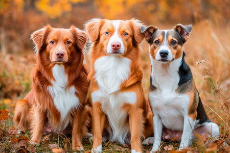 Three playful dogs sit side by side in a vibrant autumn setting, surrounded by golden leaves. Their expressions are joyful, showing their furry coats and unique personalities.