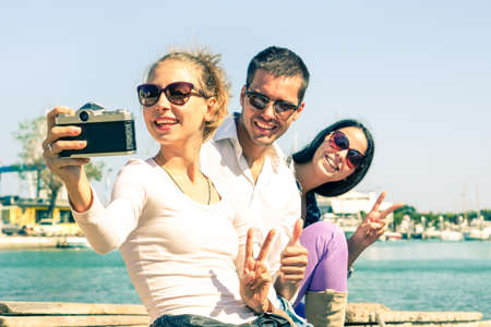 Happy best friends taking selfie with vintage camera at pier - Cheerful students on vacation having fun doing photo by the ocean - Concept of joyful moments with attractive playful teenagers outdoors