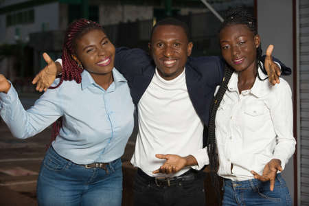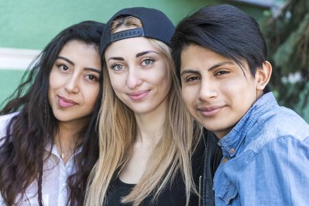 Close up of three happy young people smiling and looking relaxed in the street. Group of millennials staring at camera hopeful smiling together.