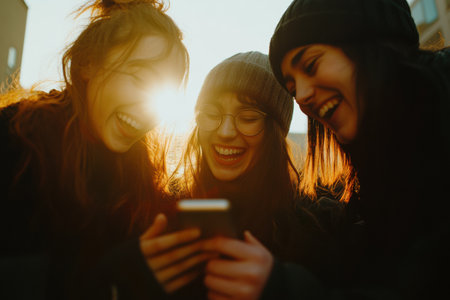 Three friends are gathered outdoors, laughing and engaging with a smartphone as sunlight shines behind them, creating a warm glow.