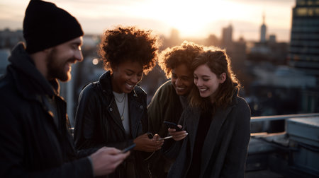 Friends sharing laughter and moments on a rooftop at sunset in the city