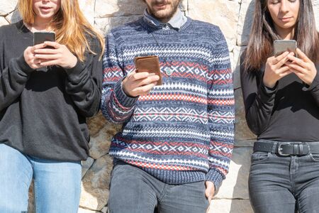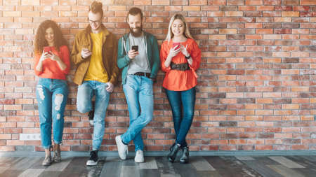 Millennials social media addicted generation. Young people in colorful outfits leaned against brick wall, using smartphones.