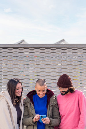 Three friends, two men and one woman, walk together in a modern cityscape, engaged with a smartphone, with blurred background people and sleek architecture.