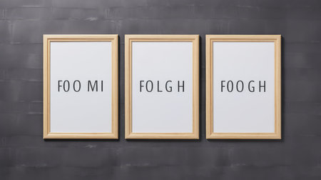 Three blank vertical vintage wooden picture frames hanging on white wall background over the wood bed in bedroom.