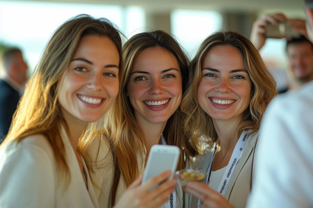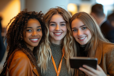 Generative AI : Three multiracial young women taking selfie photo walking on city street Millenial female friends having fun together outdoors Friendship feminist and technology