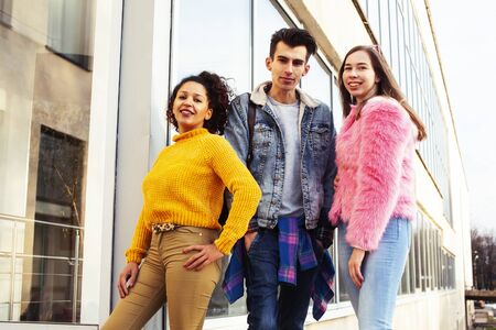 cute group of teenages at the building of university with books huggings, diversity nations real students lifestyle