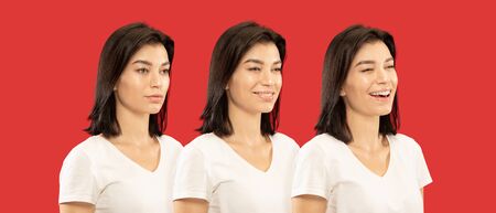 Caucasian young womans close up portrait on red studio background. Concept of human emotions, facial expression, sales. Looks calm, smiling and laughing. Flyer for your ad. Progress of emotions.