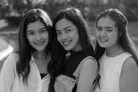 Three young Asian women as friends together at the park in black and white