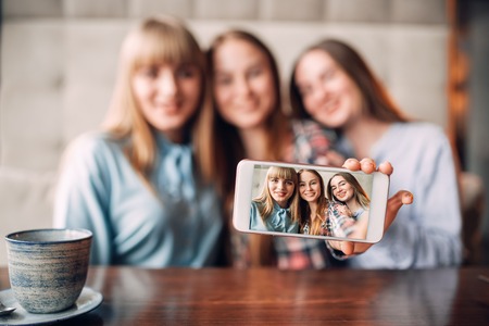 Three girlfriends makes selfie on camera in cafe