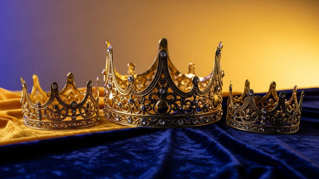This stunning image showcases three ornate golden crowns, each uniquely designed, reflecting luxury and royalty against a dark background, perfect for celebratory themes.