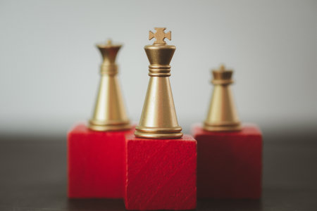 The Golden king chess piece standing on red block in front of many other chess pieces. Leadership, fighter, competition, confrontation, and business strategy concept.