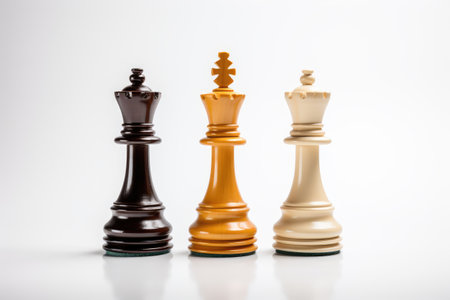 Three Chess Pieces. Three chess pieces including a king queen and rook are arranged on a stark white background. The pieces are made of contrasting colors and textures creating a striking composition.