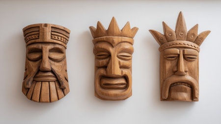 This stunning display features three wooden masks mounted on a wall, highlighting exceptional craftsmanship and artistic details. Perfect for home decor enthusiasts.