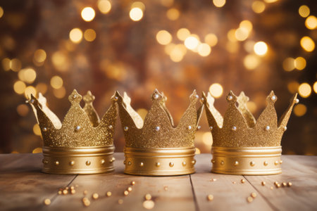 Happy Epiphany day. Three royal crowns on golden bokeh background.