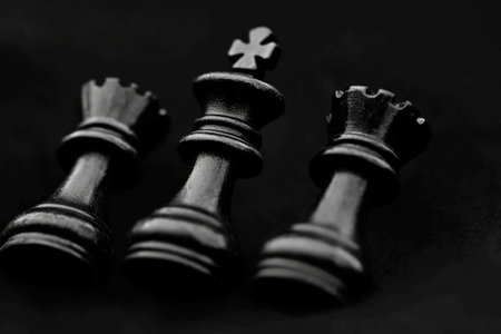 Black Chess Pieces on Dark Background - Close-Up of King and Rook Figures in Strategic Arrangement.