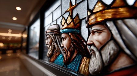 This stunning stained glass artwork features three wise men portrayed with exquisite detail, showcasing their distinctive facial features and colorful garments.