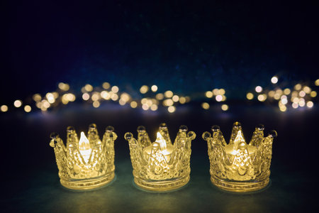 Epiphany. Candlelit Crowns. Three crown-shaped candle holders glowing