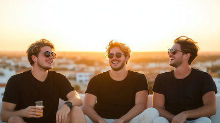 Three young men, wearing sunglasses and black t-shirts, are sitting together, laughing and enjoying the sunset.