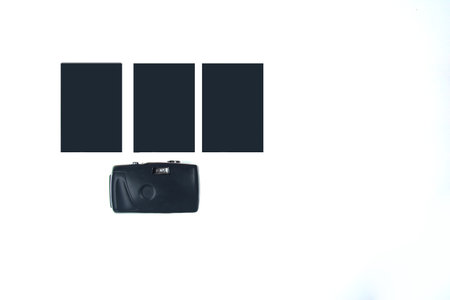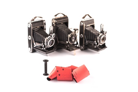 120 film for medium format retro cameras on white background with shadows, blurry vintage cameras on background, can move object right or left for create space for text