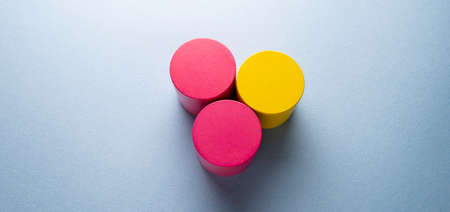Top view of three round colorful cylinders on gray background. Flat lay.