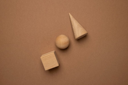 Wooden toy children's sorter with small wooden details in the form of geometric shapes rectangle, square, triangle on a brown background, figure concept top view