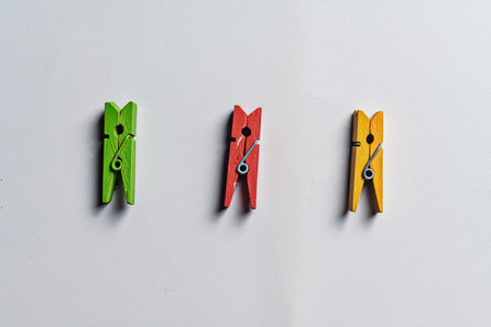 Green, red, and yellow wooden clothespins arranged in a row. Minimalist design for concepts related to laundry, chores, housework, and organization