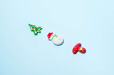 Christmas decoration on blue backdrop. Minimal trendy colors.