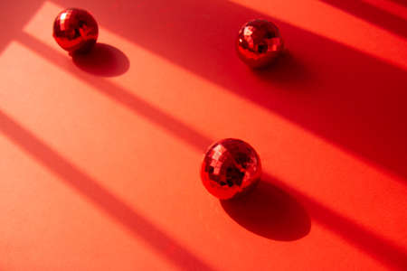 Three red Christmas balls on red background with contrasting shadows. Merry Christmas card. Concept of celebrating new year