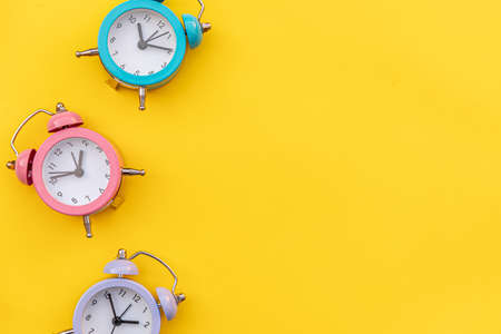 Retro alarm clock on yellow background with blue pink pastel circles for copy space. Top view