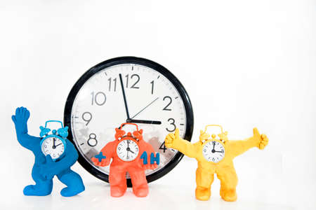 Funny ClockMan made from Play Clay. Isolated on white background. Daylight Saving Time Concept.