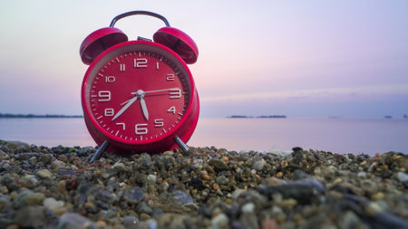 A bright red alarm clock is positioned on a bed of pebbles along a peaceful beach