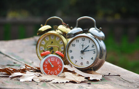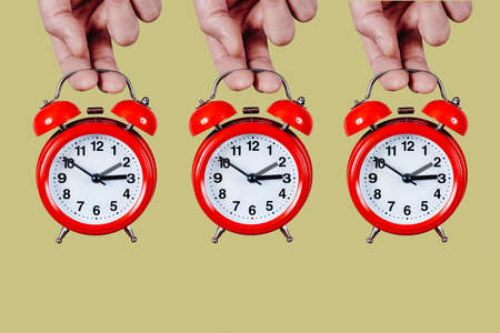three men hands holding classic red alarm clocks that are setting one hour backwards or forwards, at the beginning or the end of the summer time