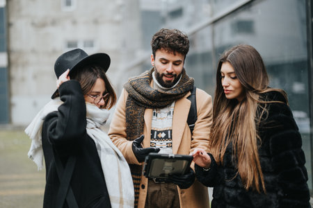 three young male and female friends take a selfie having fun and showing the photo on the smartphone screen in a public park in winter