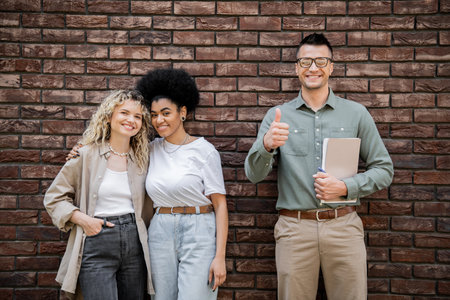 overjoyed real estate agent showing thumb up near interracial lesbian couple hugging near cottage