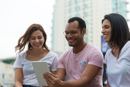Smiling people sitting in park and looking at tablet. Cheerful friends hanging out together. Communication and technology concept