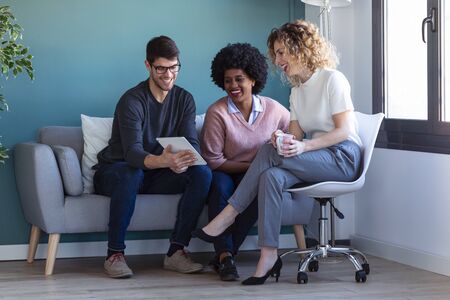 Shot of casual young business people working with the digital tablet while are sitting in the new office.