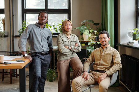 Portrait of three young intercultural coworkers in smart casualwear looking at camera while confident leader of business team sitting in armchair