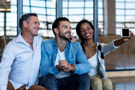 Group of young cheerful businesspeople taking a selfie together at work. Happy african american businesswoman taking a picture with her colleagues on her phone in an office