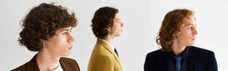 Three young men stand confidently, each displaying unique styles in a minimalist studio atmosphere.