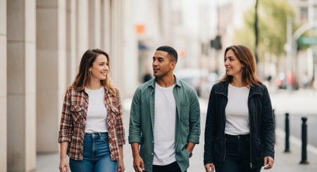 A trio of young adults, two women and one man, stand confidently in a chic city environment, showcasing their trendy outfits. Their warm smiles and relaxed postures radiate friendship and camaraderie, capturing the essence of youthful energy and urban lifestyle.