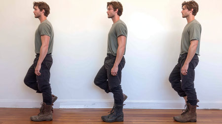 A man is shown in a side view walking pose, dressed in casual attire. The minimalist setting highlights his confident stance and athletic build.