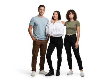 Three young adults stand against a minimalist white wall; a woman on the left looks at the man in the center, who looks at the woman on the right. The image captures casual fashion, social dynamics, and diverse relationships in a studio setting.