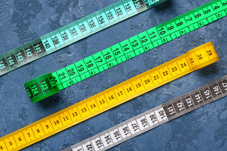 Colorful measuring tapes on blue grunge background