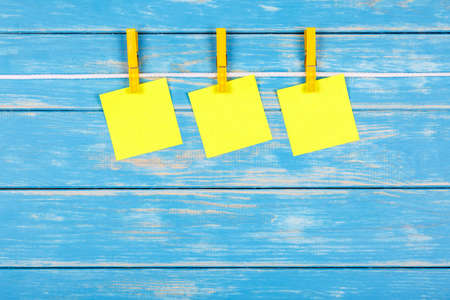 View of three clothespins hanging on a rope with cards
